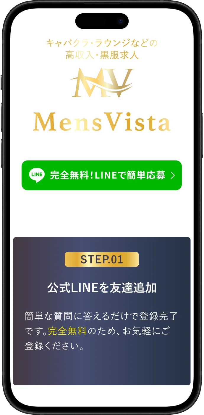 メンズヴィスタは、キャバクラ、ラウンジ、クラブなど全業種を網羅し、独自の基準で厳選した優良店の情報だけを掲載しています。数多くの選択肢の中から、あなたの「理想の給与」「勤務地」「働き方」にピンポイントで合う店舗を必ず見つけられます。